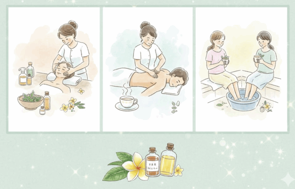 • (整体20分~/足つぼ30分~/ふくらはぎ20分~/ハンド20分~/眼精疲労10分~)